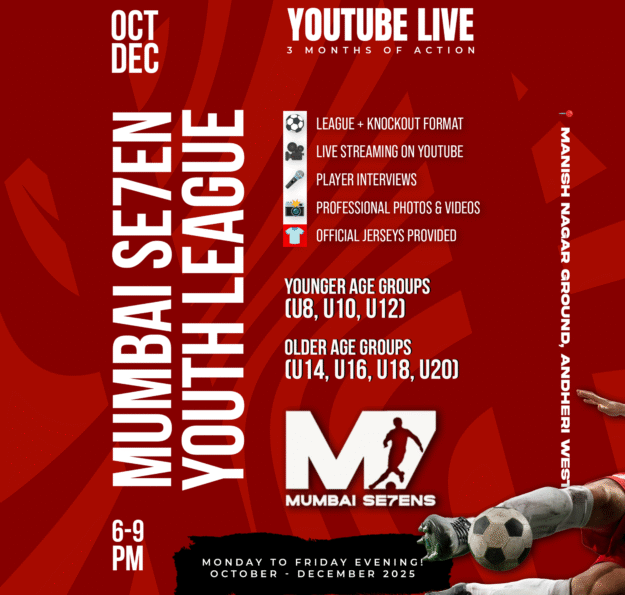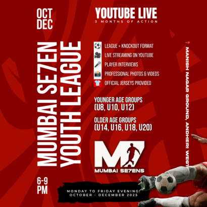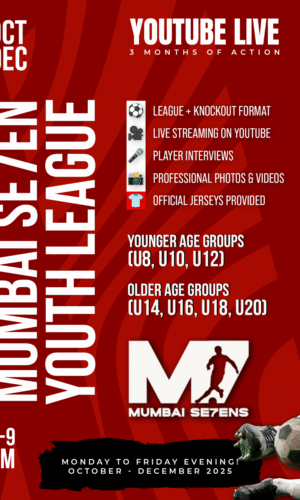Mumbai Se7ens is Mumbai’s biggest 7-a-side football league, inspired by Kerala’s unmatched football craze. With 16 Elite Teams, Pro Referees, VAR, Live YouTube Coverage, and ₹4.5 lakh in prizes, we redefine grassroots football—under floodlights, in true knockout drama.